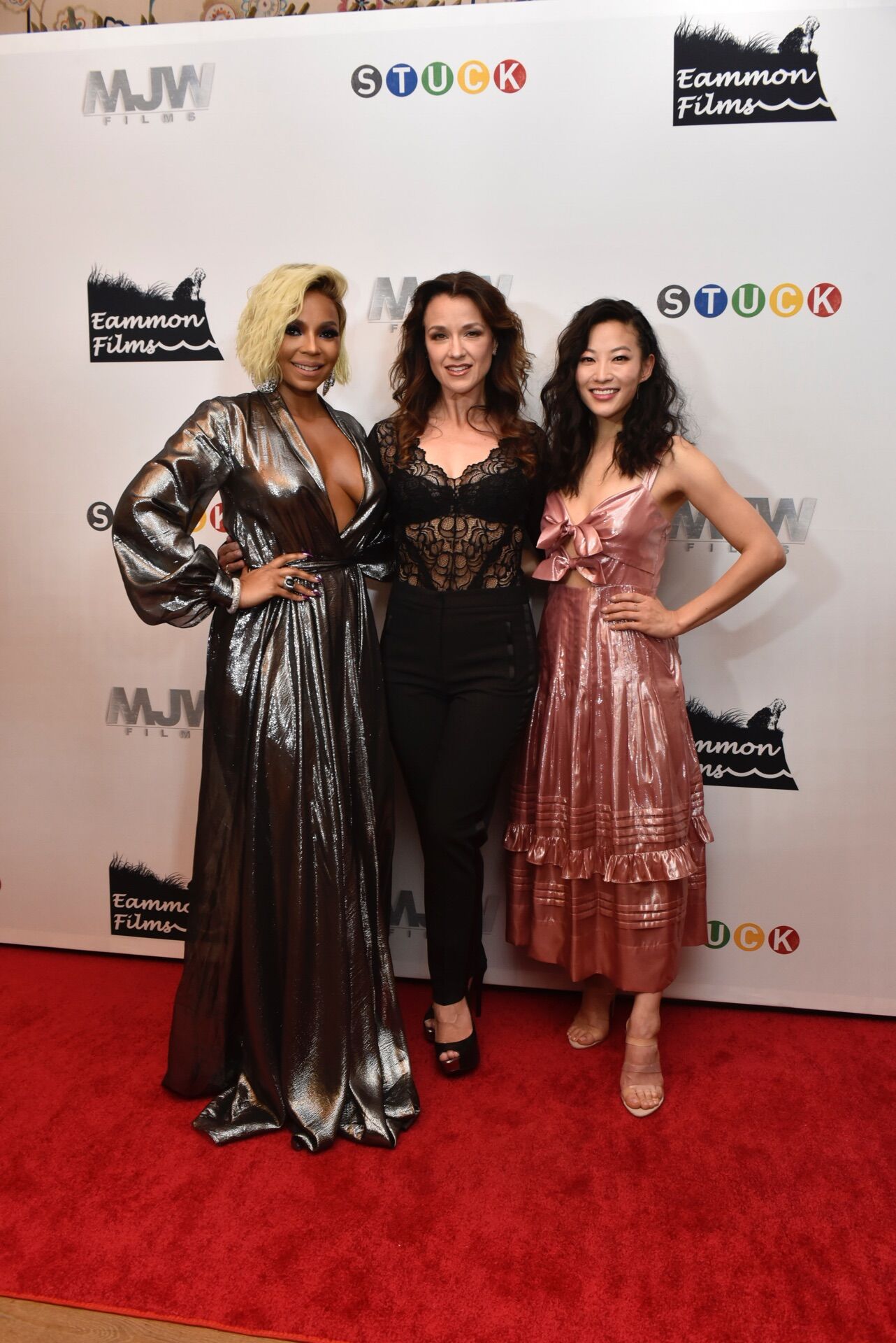 Ashanti and Arden Cho shined in stunning metallic dresses and discussed what they loved about their roles in STUCK, a pop musical film set on the New York City subway, riding into theaters on Friday, April 19. Ashanti wore a low-cut metallic silver dress by Escada paired with Lorraine Schwartz jewelry. Arden Cho wore a pink metallic dress by Rebecca Taylor paired with clear strap Vince Camuto shoes.