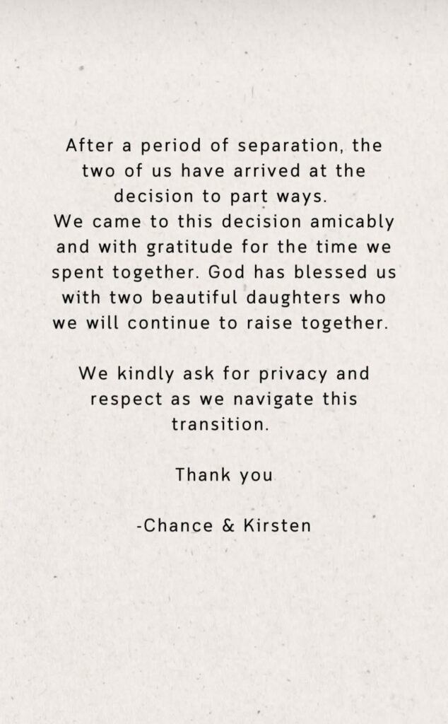 After a period of separation, the two of us have arrived at the decision to part ways. We came to this decision amicably and with gratitude for the time we spent together. God has blessed us with two beautiful daughters who we will continue to raise together. We kindly ask for privacy as we navigate this transition.