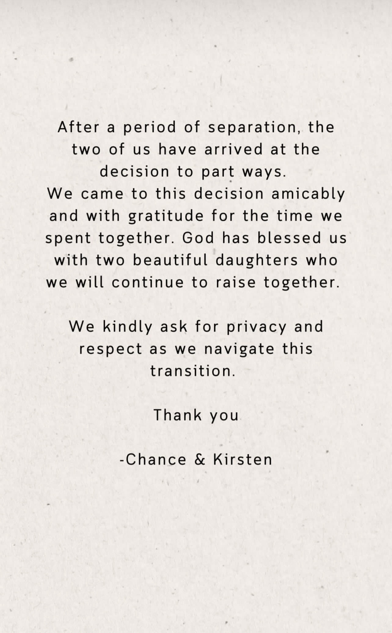 After a period of separation, the two of us have arrived at the decision to part ways. We came to this decision amicably and with gratitude for the time we spent together. God has blessed us with two beautiful daughters who we will continue to raise together. We kindly ask for privacy as we navigate this transition.