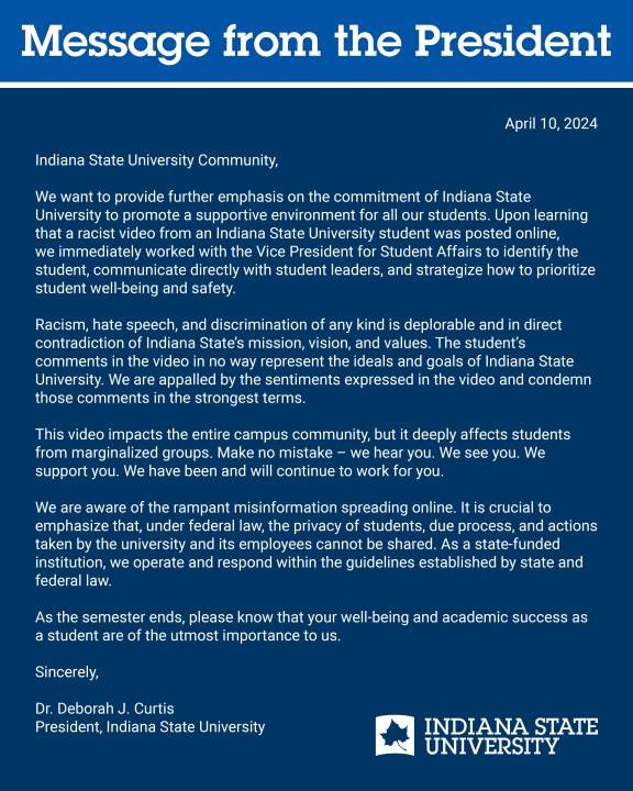 Curtis released a statement in response saying “…Upon learning that a racist video from an Indiana State University student was posted online, we immediately worked with the Vice President for Student Affairs to identify the student, communicate directly with the student leaders, and strategize how to prioritize student well-being and safety.” The statement went on to say, “This video impacts the entire campus community, but deeply affects students from marginalized groups. Make no mistake – we hear you. We see you. We support you. We have been and will continue to work for you… As this semester ends, please know that your well-being an academic success as a student are of the utmost importance to us.”